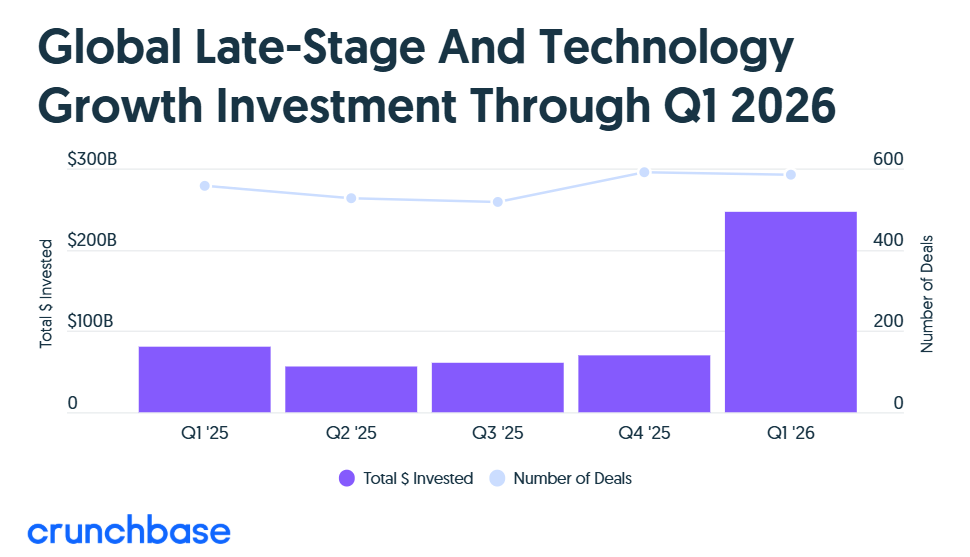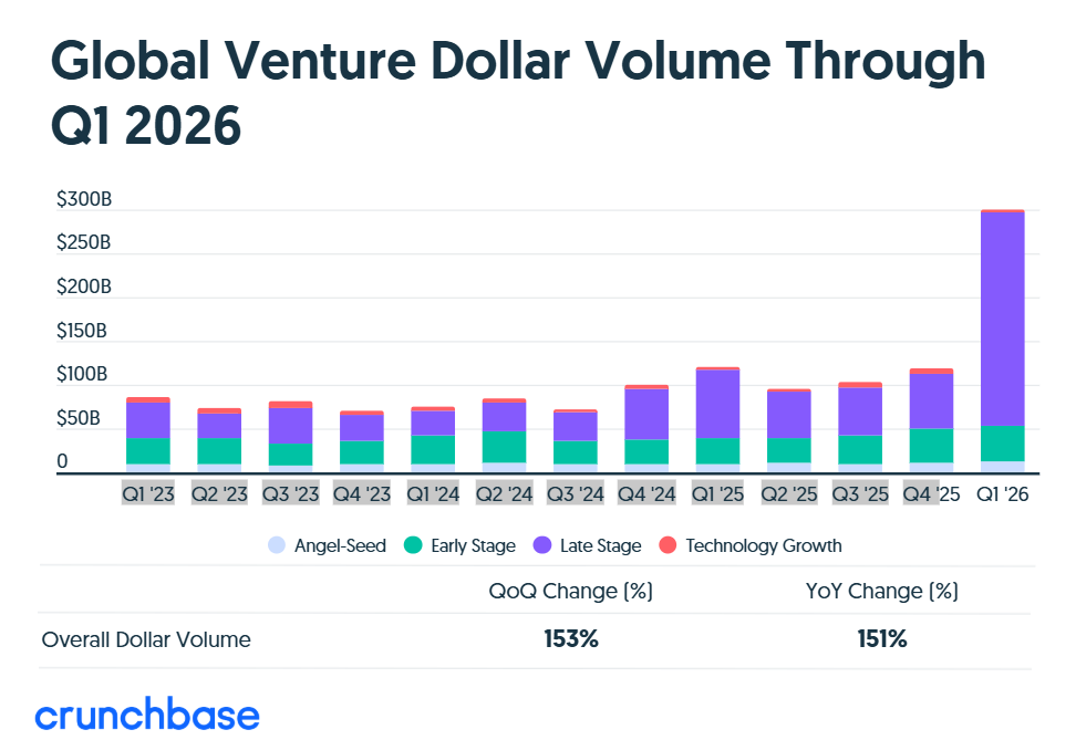 The first quarter of 2026 was unlike any other for venture investment, driven by unprecedented spending on AI compute and frontier labs. Crunchbase data shows investors poured $300 billion into 6,000 startups globally in the quarter, up over 150% quarter over quarter and year over year.