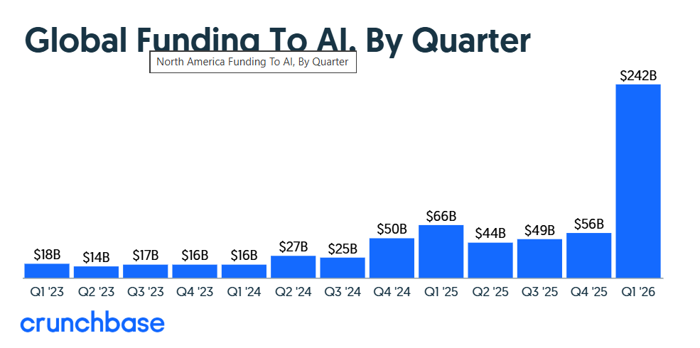 Overall, AI shattered records last quarter, with $242 billion — 80% of total global venture funding in Q1— going to companies in the sector. The previous record was set in Q1 2025, when AI accounted for 55% of global venture funding.